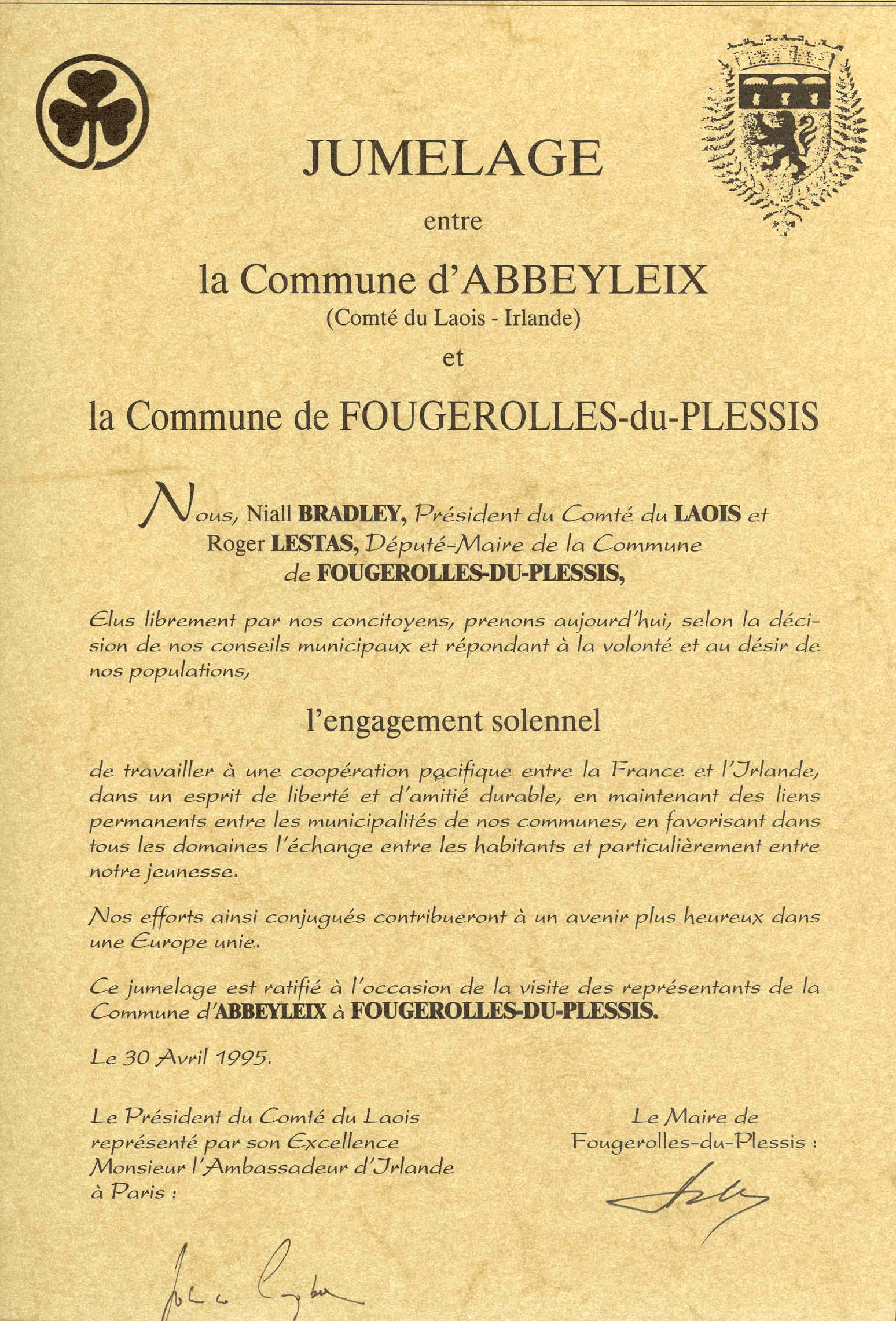 En 1995, Roger Lestas, député maire, a contribué au jumelage de Fougerolles-du-Plessis avec Abbeyleix (Comté de Laois en Irlande)